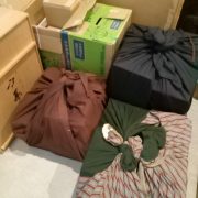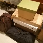 一旦ご用意いただいたお道具の拝見が終わり、最初に言っておられた倉庫へお客様と一緒に行きました。するとこちらが一見してわかるお茶道具が入っているであろう木箱や、風呂敷包み、目に止まったお茶道具以外の物を運び出し拝見させていただきました。